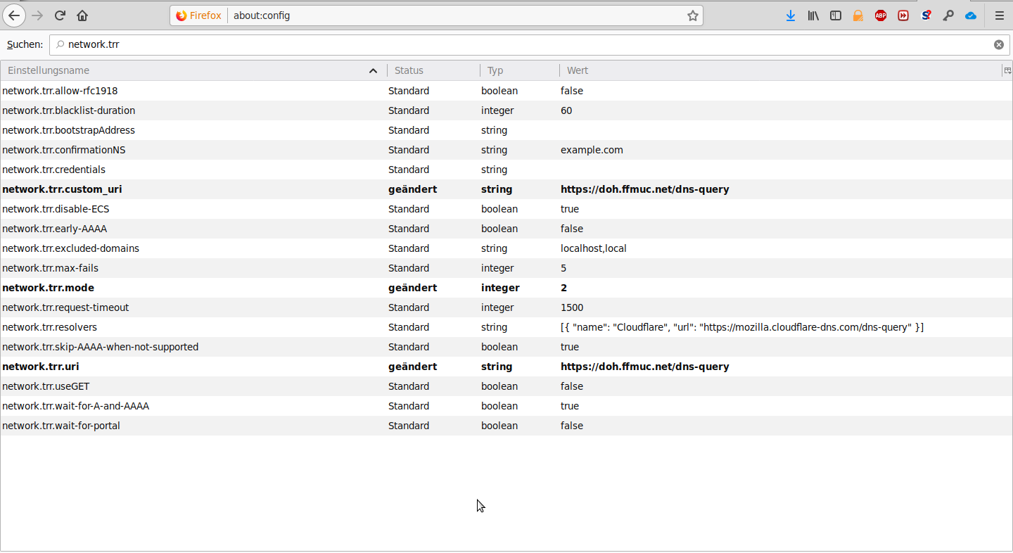 The settings in Firefox can be made conveniently via the interface. Detailed instructions can also be found directly at mozilla.org at: https://wiki.mozilla.org/Trusted_Recursive_Resolver For the German-speaking user there is also a detailed explanation/guide in Privacy Manual!
