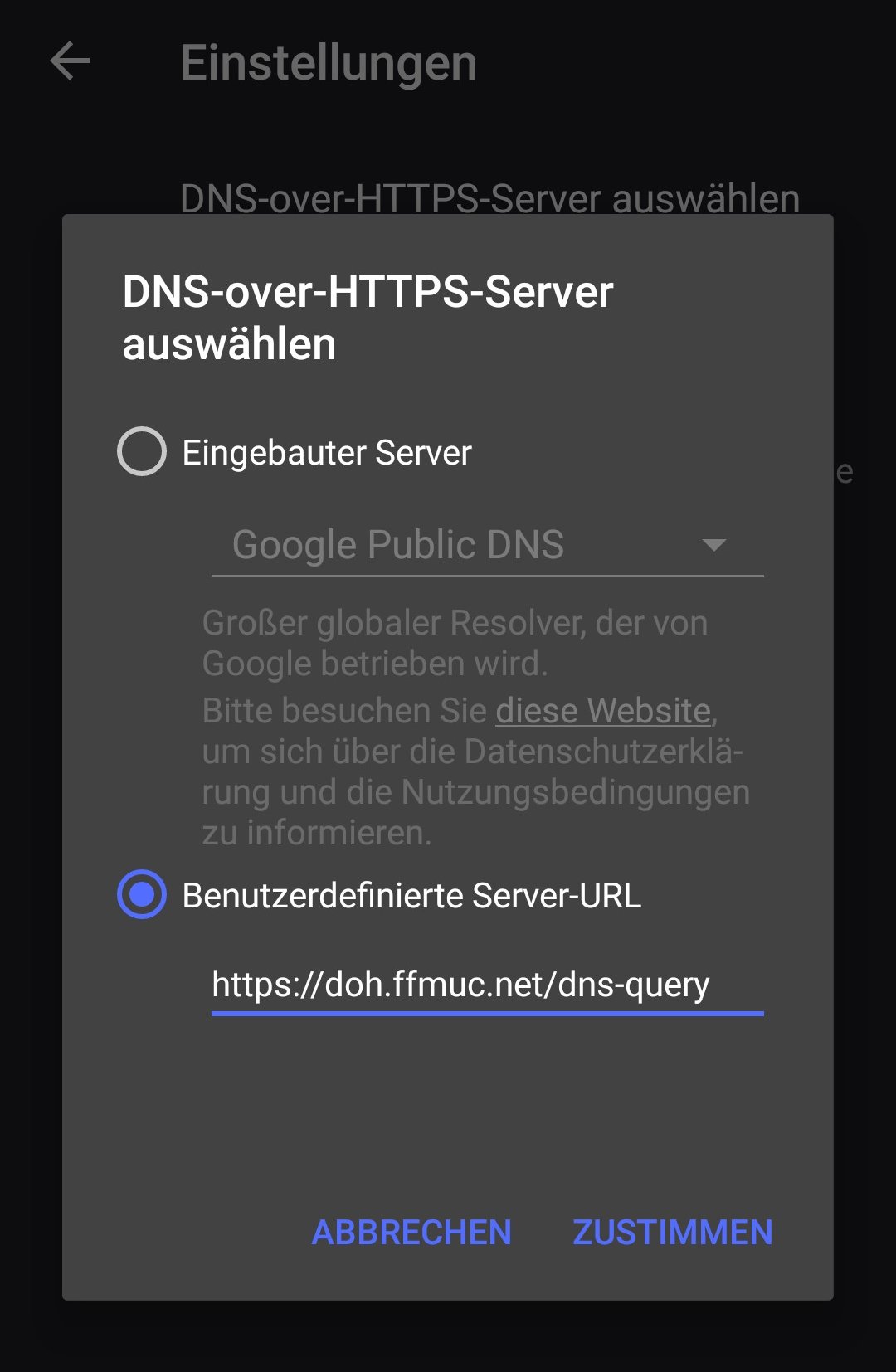 There you enter https://doh.ffmuc.net/dns-query as „User-defined server URL“: