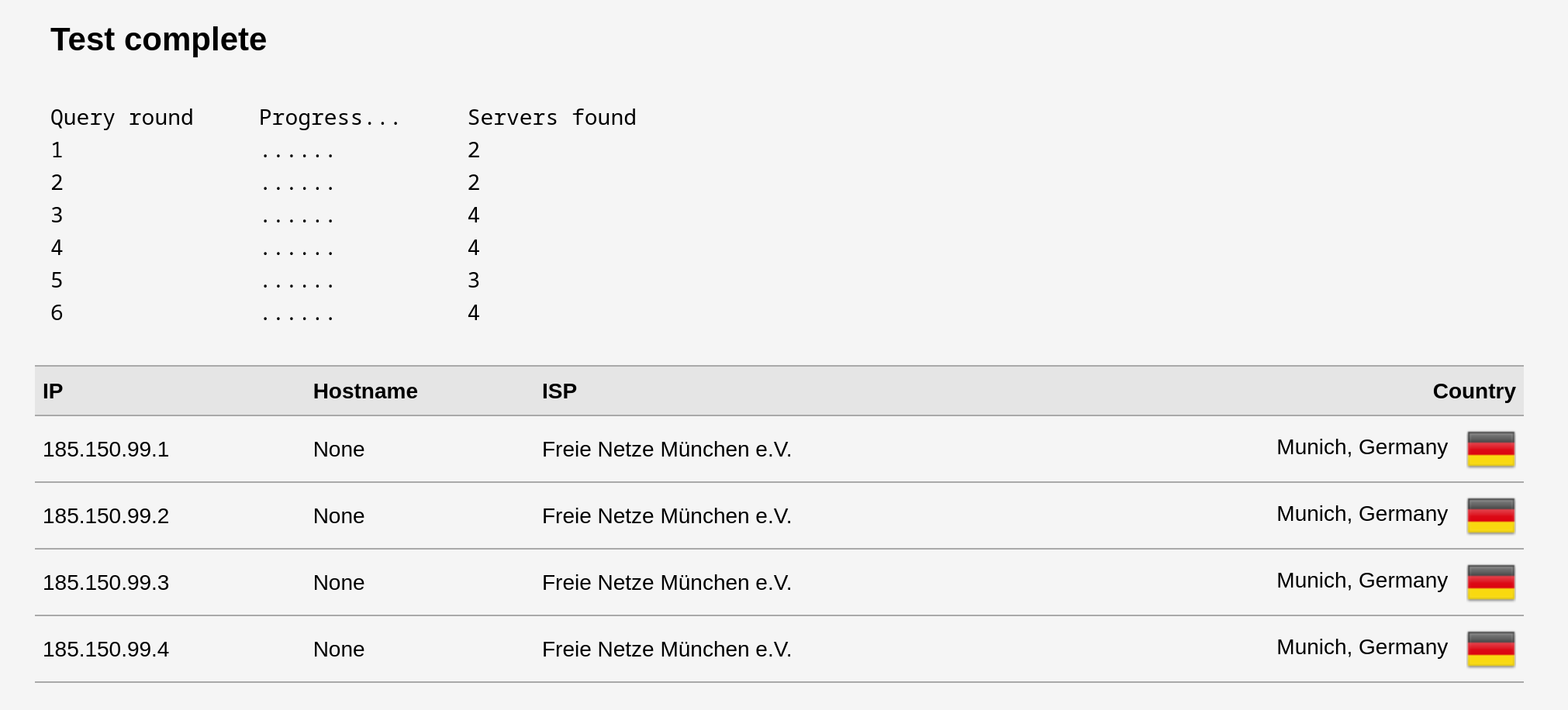 Bild: Ergebnis beim Testen via dnsleaktest.com (It can also show a different set of IP addresses in the 5.1.66.0/24 IPv4 prefix from our other PoP in Vienna, Austria)