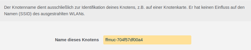 Hier wird der Name des eigenen Knotens definiert. Am besten wählt man einen sprechenden Namen, den man leicht auf der Knotenkarte wiederfinden kann. Vorgeschlagen wird ein generischer Name, der von der MAC-Adresse des Routers abgeleitet wird.