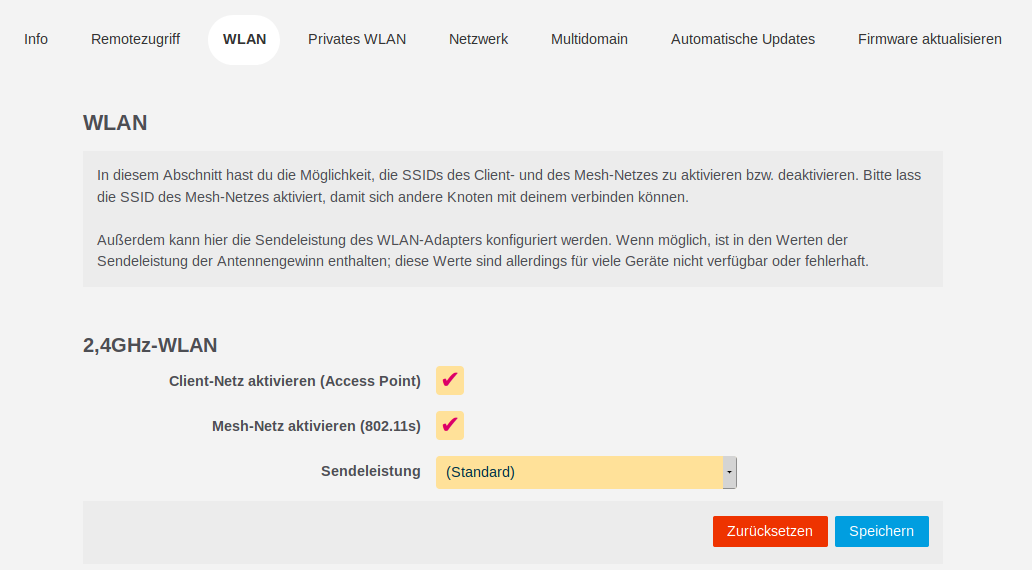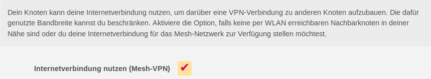 - Mesh-Netz aktivieren (802.11s) steht für das Freifunk-Meshnetzwerk, über das sich Freifunkrouter per Mesh-WLAN untereinander verbinden und Routen zum zentralen Tunnelgateway bilden können. Das WLAN-Mesh-Netz deaktiviert man z.B., wenn nicht zu erwarten ist, andere Freifunker in WLAN-Reichweite anzutreffen oder der Knoten für andere Aufgaben (Mesh-on-LAN, Offloader) vorgesehen ist.