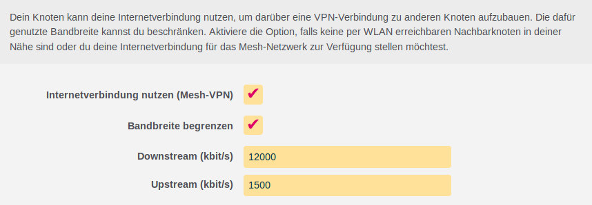 Falls dies jedoch trotzdem gewollt ist, kann durch Aktivierung der Option die Download- und Uploadrate begrenzt werden. Es erscheinen zwei neue Eingabefelder, in dem die maximal zur Verfügung gestellt Bandbreite in Kbit/s für alle Freifunk-Nutzer definiert werden kann. Für den Downstream wird an einem DSL 50/10MBit 25000 und für den Upstream 5000 empfohlen, bei leistungsstärkeren Anschlüssen entsprechend mehr.
