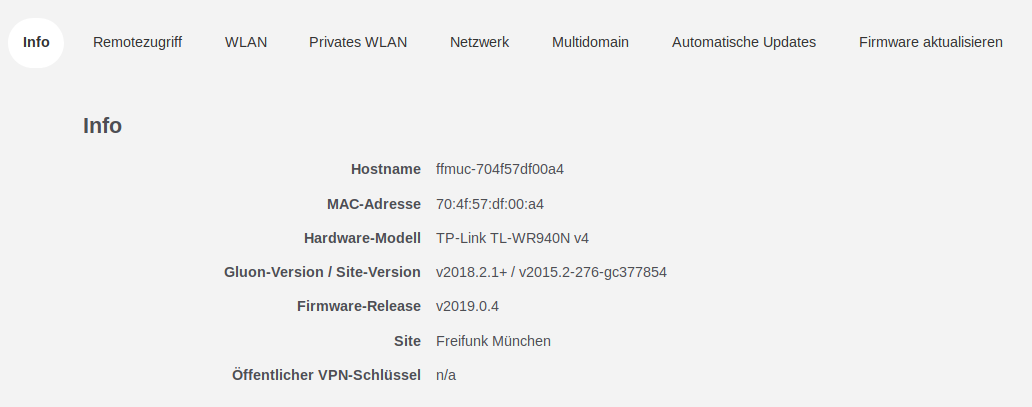 - Öffentlicher VPN-Schlüssel Public-Key des fastd-VPN (dieser wird derzeit nicht verwendet)