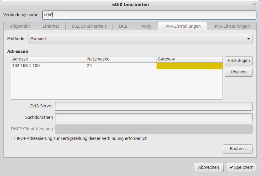 Dies erledigen wir mit dem Netzwerk-Management-Tool unseres Vertrauens, wie z.B. NetworkManager-GUI oder der Windows Netzwerkeinstellungen unter Adaptereinstellungen ändern, LAN-Verbindung, Eigenschaften, Internetprotokoll-Version 4.